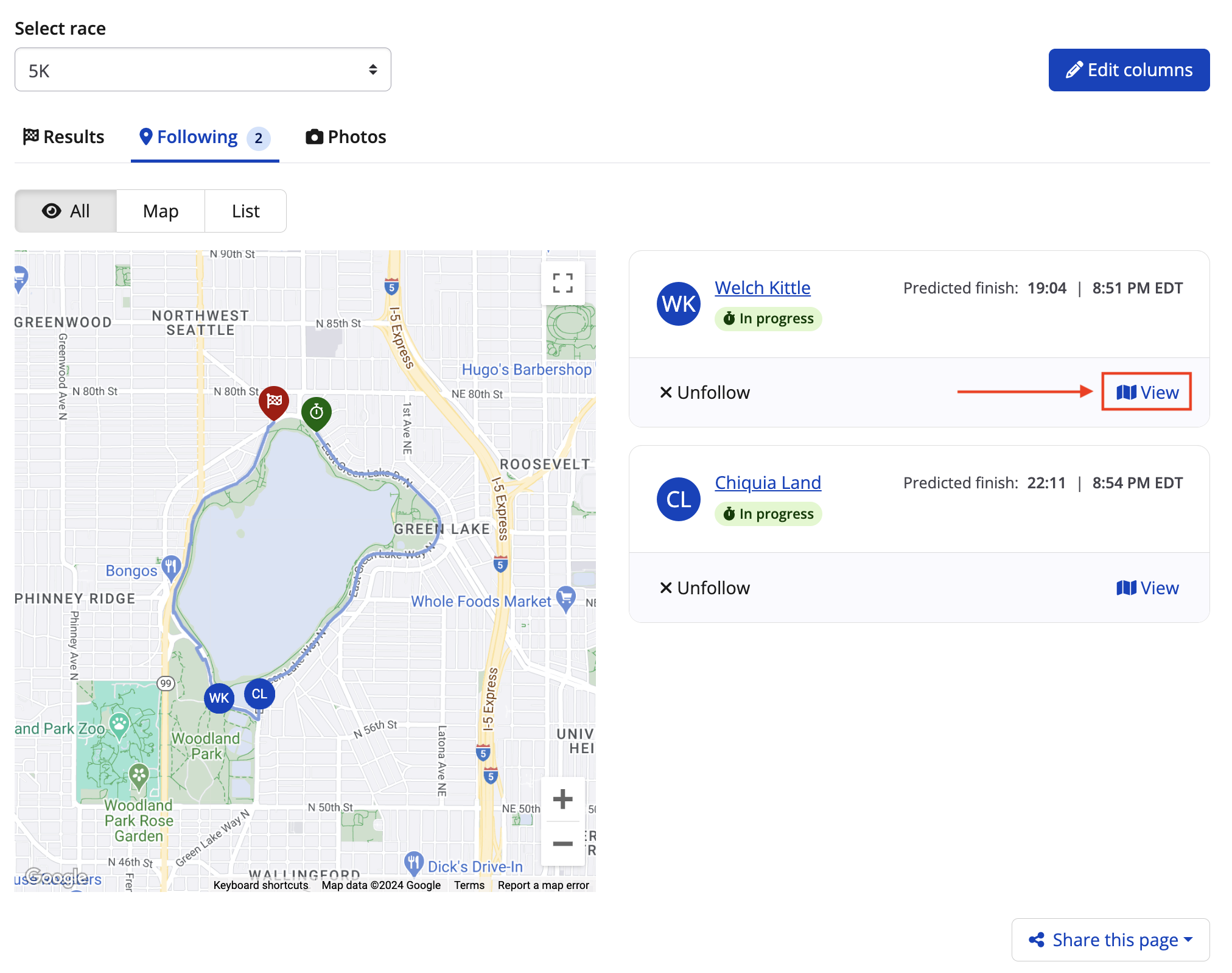 10. To highlight a specific runner on the race route, click the View button within the runner's predicted finish tab on the righthand side of the page.