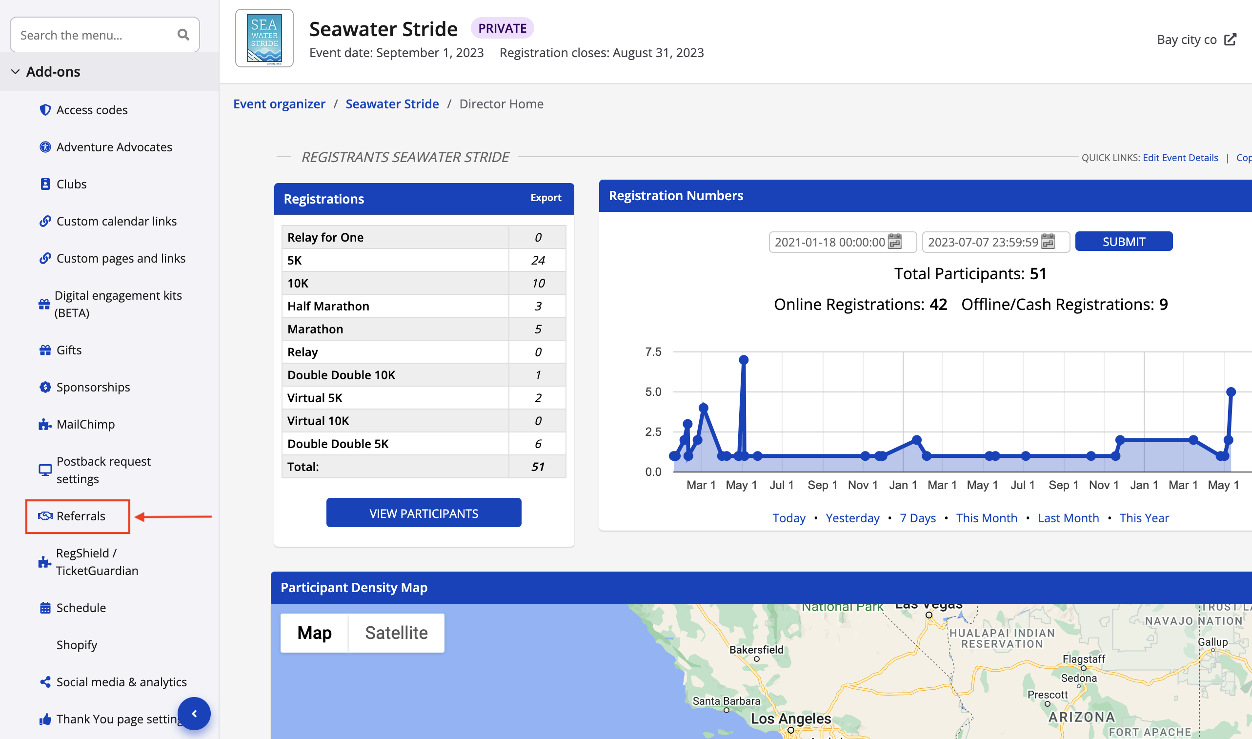 Race Roster offers a referral tool within the event dashboard that allows participants to act as promoters for the event by referring their friends and family to register. Promoters can receive monetary rewards for their efforts and successful referrals that the event has put in place.
