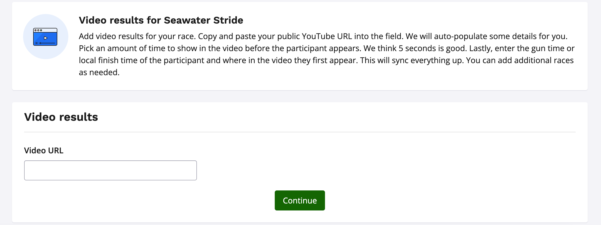 The video results tool allows timers or event organizers to post a video of their event finish line or any point on the course that has a timing mat (ie. key splits). This video along with uploaded gun times, allows for viewing of the participant as the approach and cross the timing mat/finish line.
