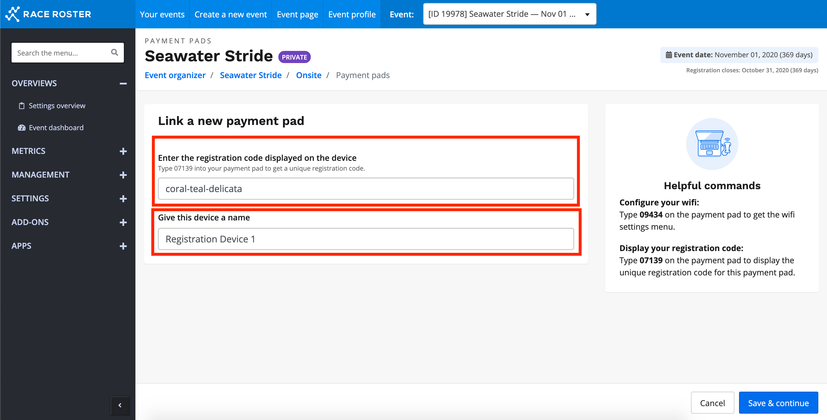 9. To link a payment pad, you will need a unique registration code by pressing 07139 on the pay pad. Enter this unique code in the first text field of Link a new payment pad.