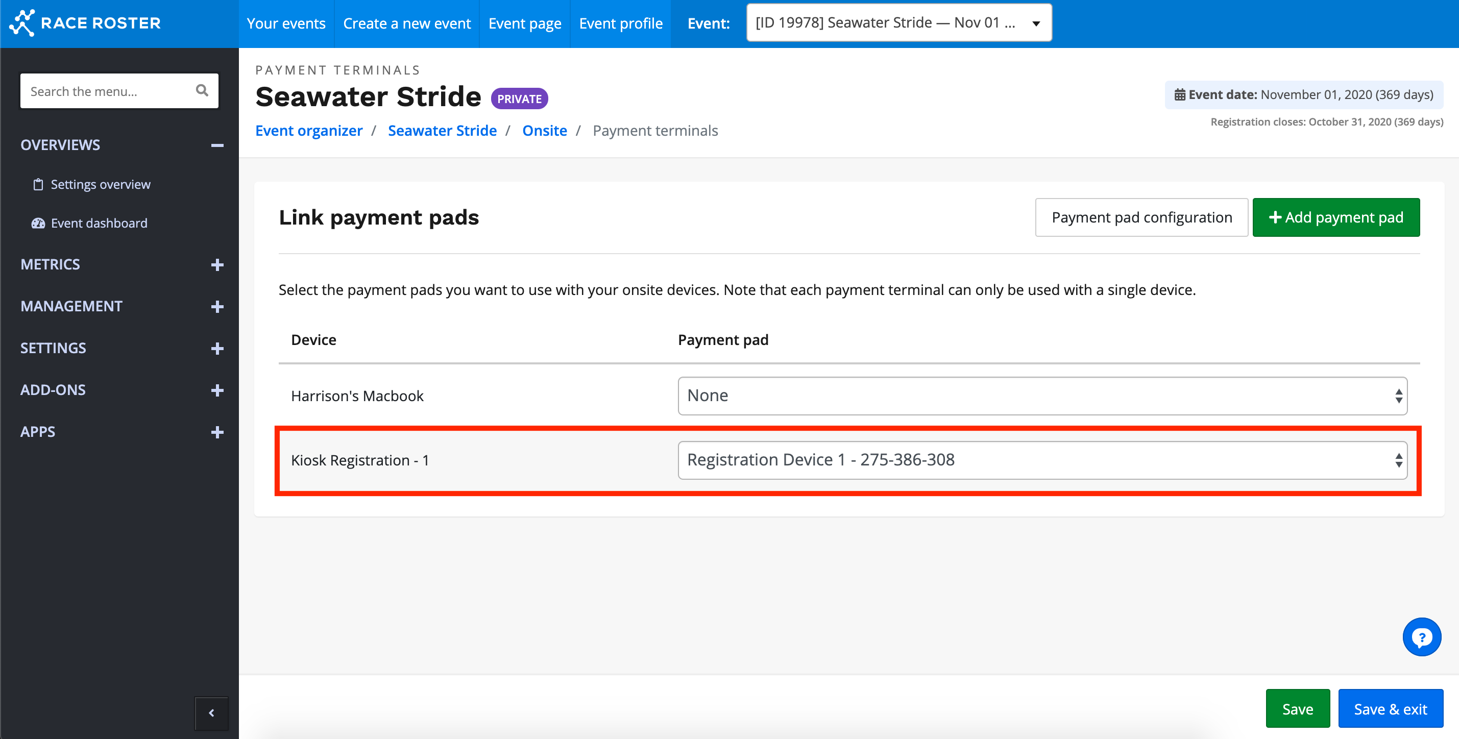 For instructions on how to set-up onsite devices click here. For further information on Pay Pads and Stripe Terminals click here.