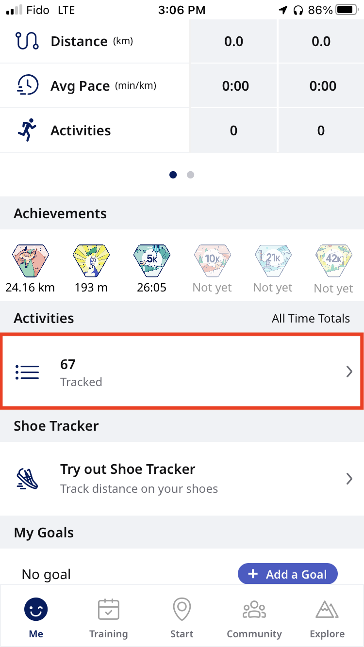 - Next, scroll down while still on the "me" page and click on activities -> tracked