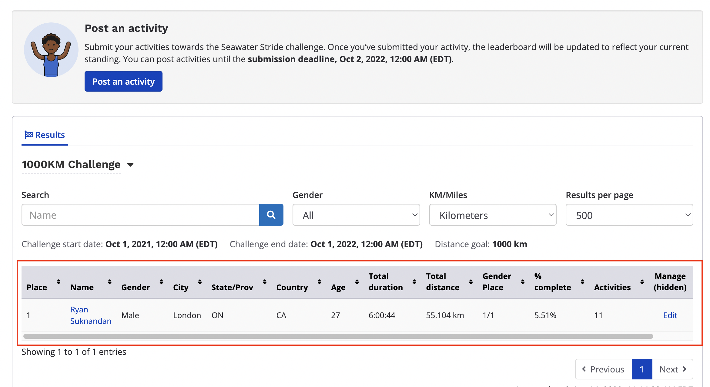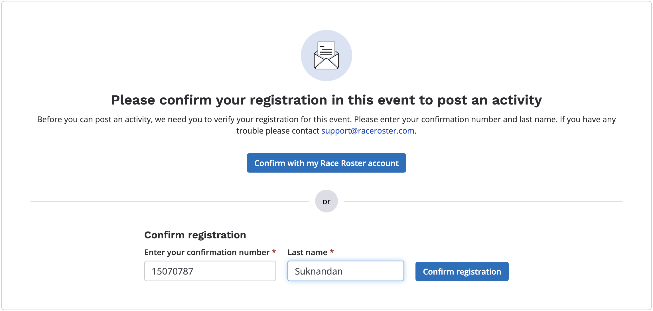 3. Upon landing on the event's results page, you can begin to add an activity by clicking the post an activity button and entering in your unique confirmation number and last name attached to your registration to have it validated by the system to confirm you are registered for this event.