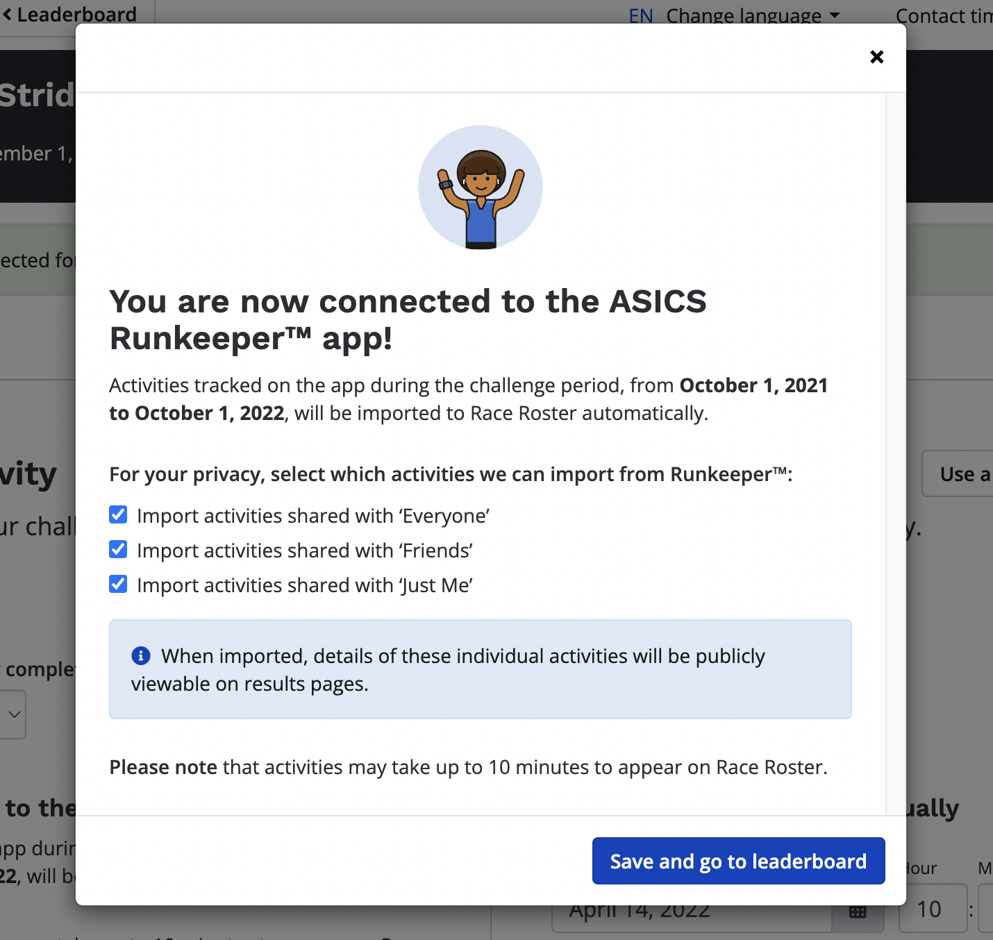 10. Once ready, return to the Race Roster submission page and click save and go to leaderboard on the privacy settings window. You will be redirected to the event's results leaderboard. Results may take up to 10 minutes to pull from Runkeeper and fully display on Race Roster.