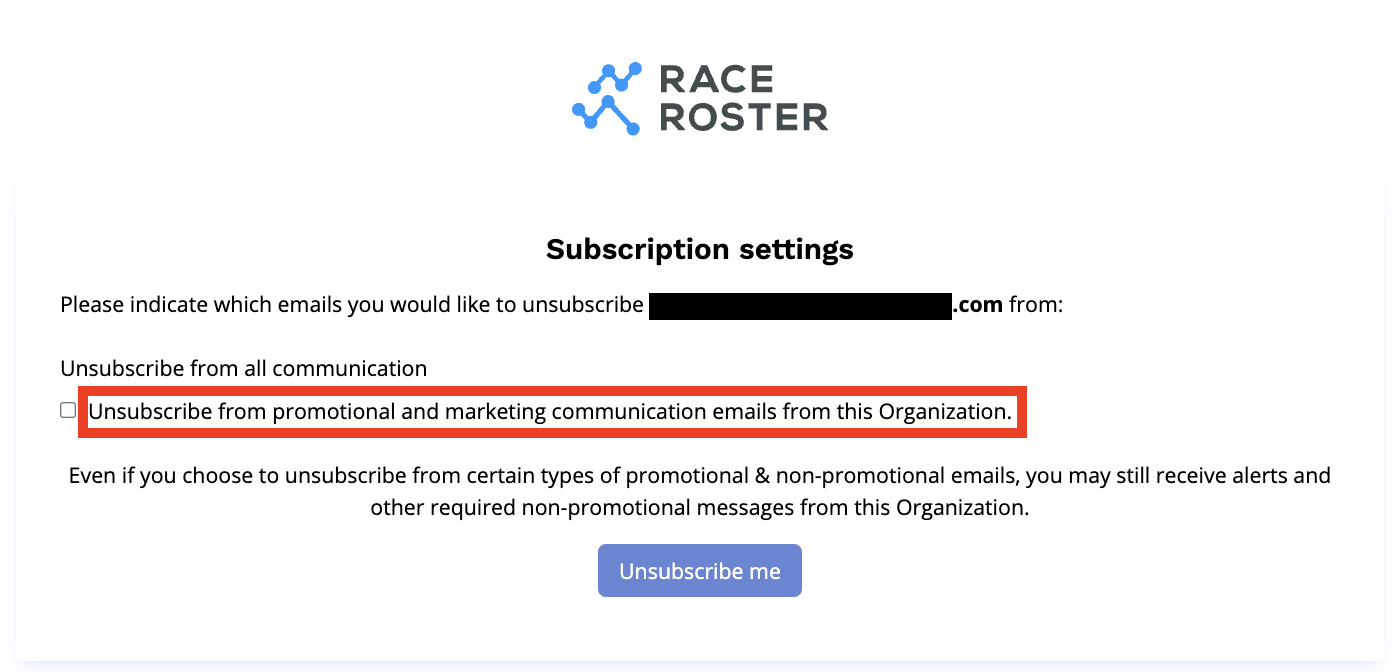 Questions about unsubscribing from event emails? Visit our article Managing my subscription status to Race Roster and event emails .