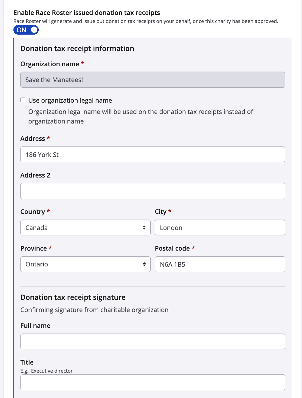 Our Race Roster team will receive the request, reach out to the charity to verify that all the information is correct, and approve the charity receipting. Once approved, the next individual that donates and requests a charity receipt will receive one automatically via email using the information entered in the above form. Receipts will not be retroactively issued until we receive this approval.