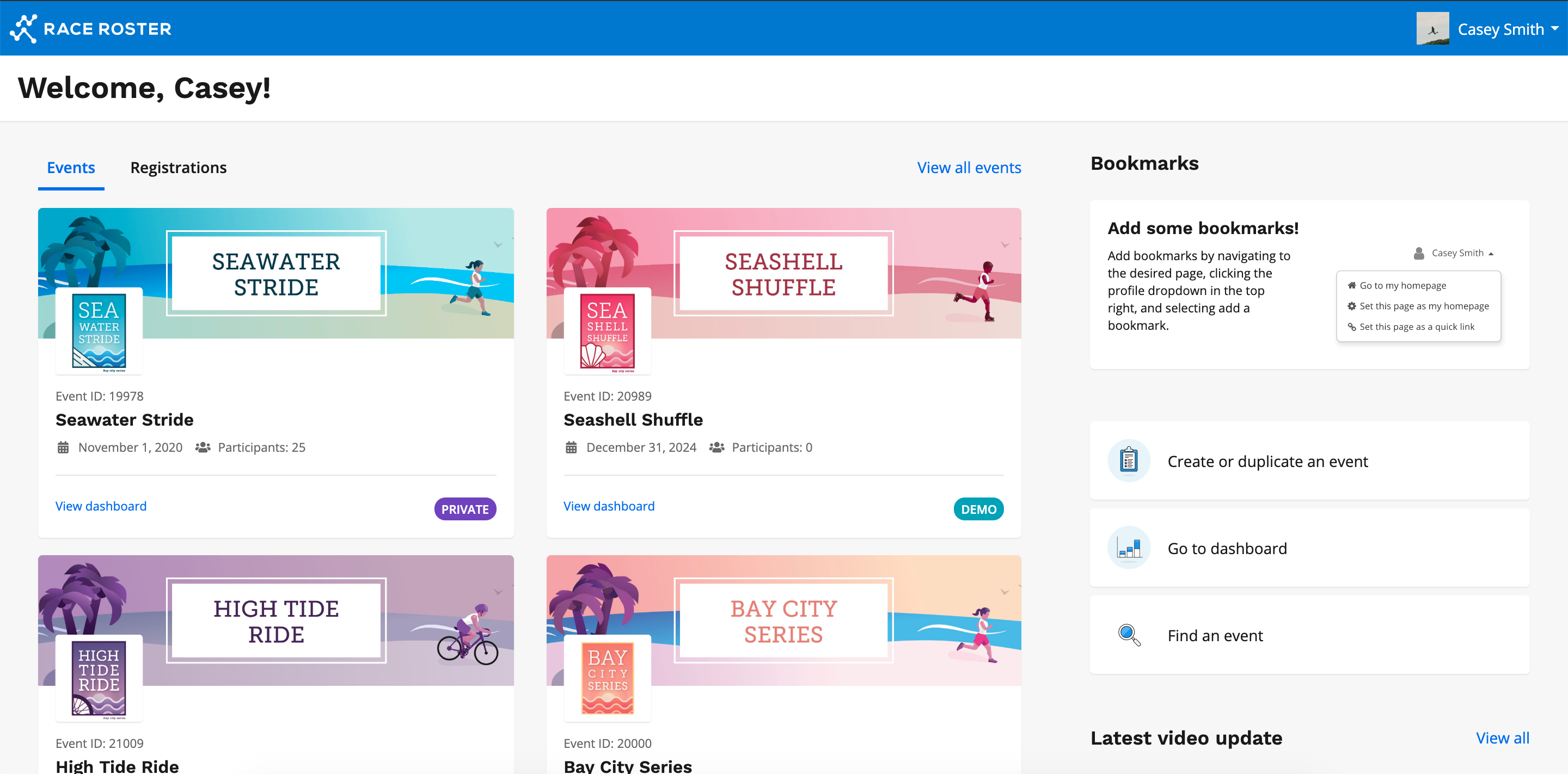 3. You will then be taken to your welcome page where you will have access to all of the events you manage and/or registered for.