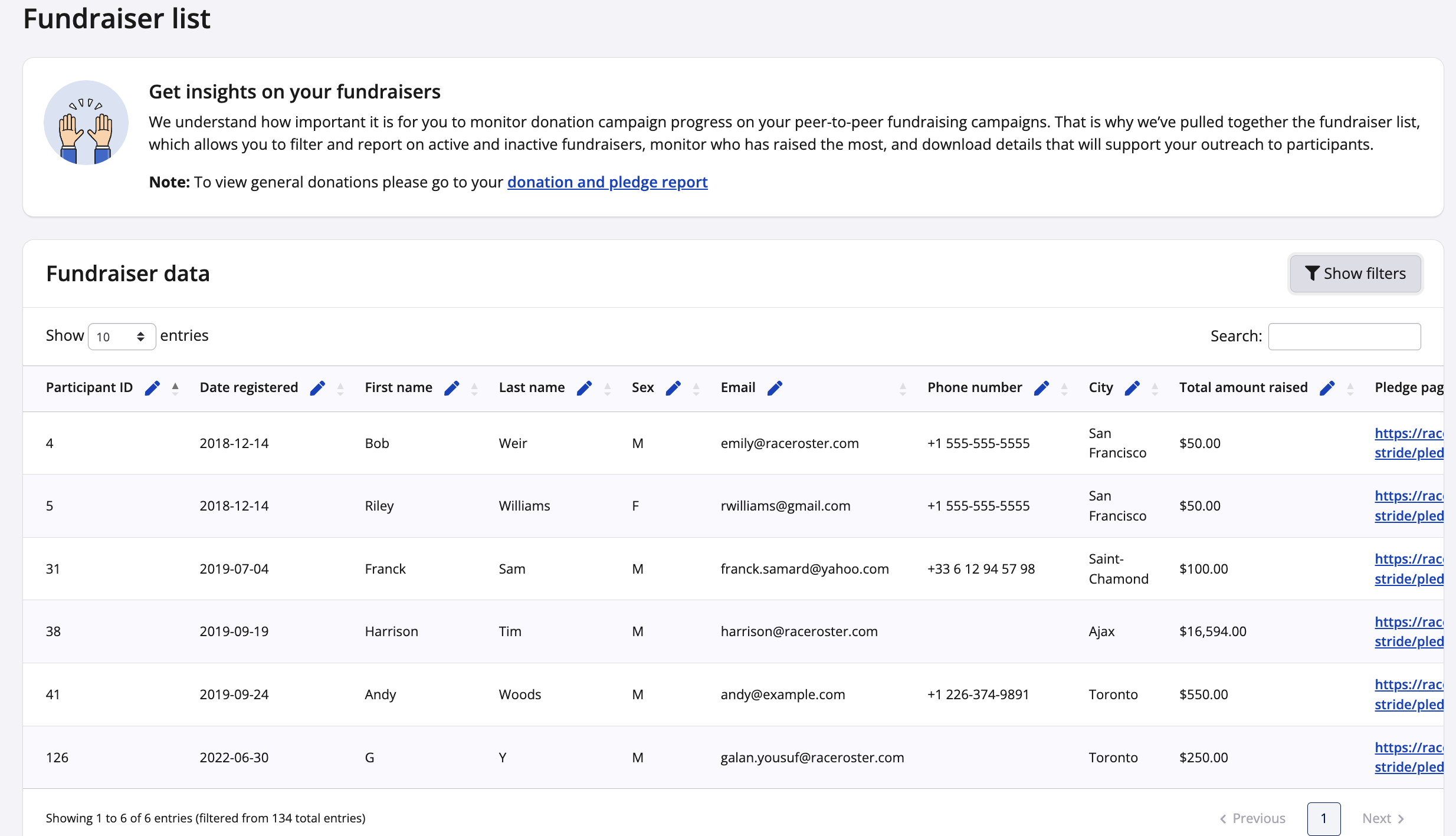 - Fundraiser information (e.g. total amount raised, pledge page URL, pledge goal, etc.)