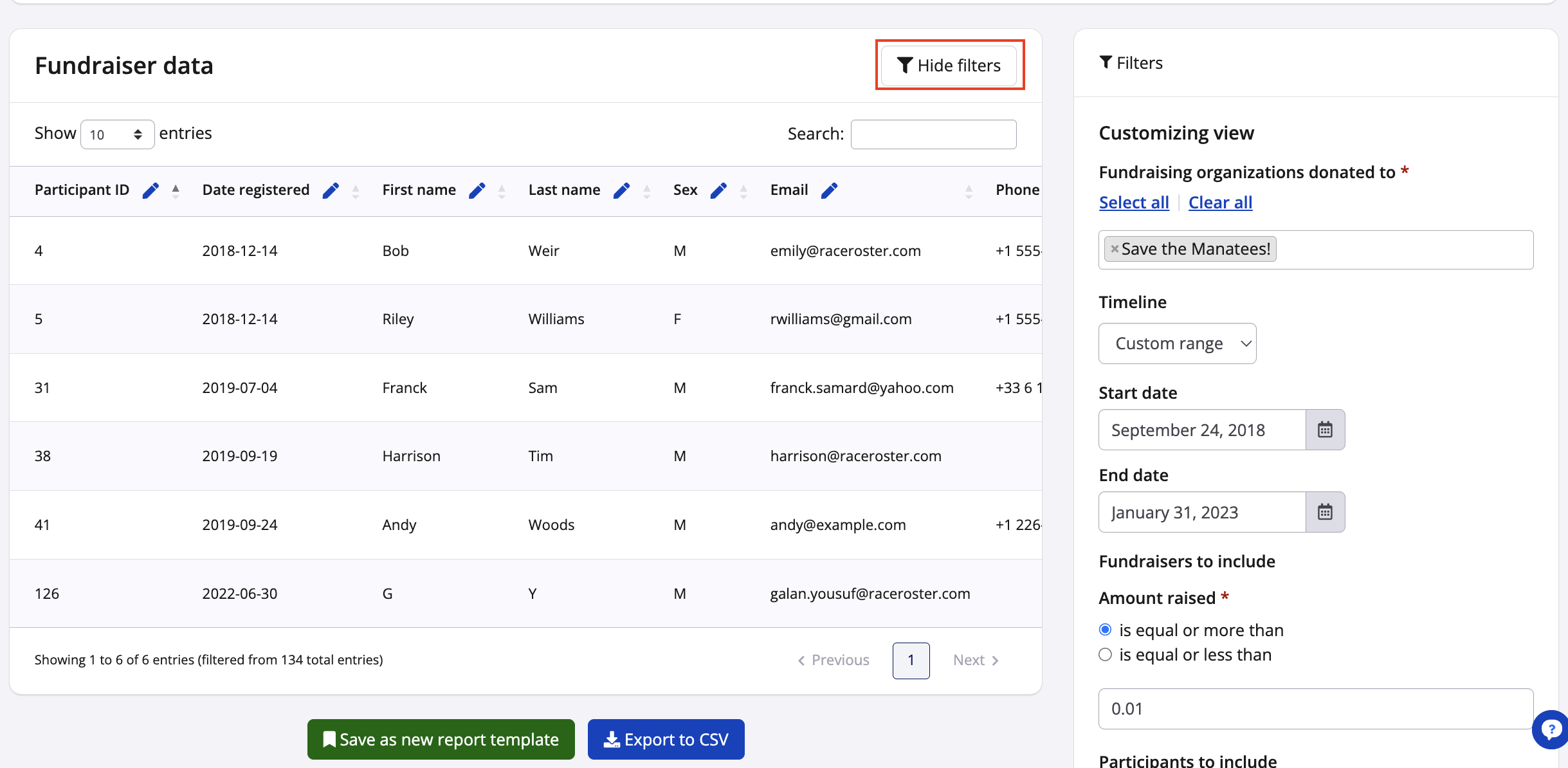 - Click Export to CSV to save your fundraisers' list in an excel file