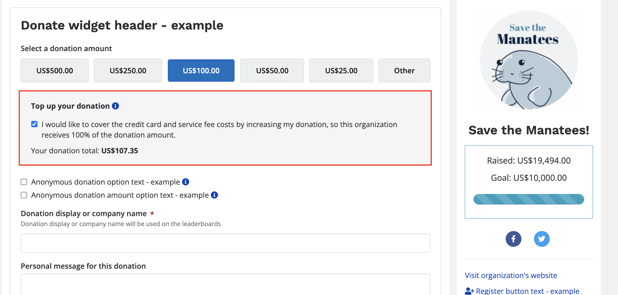 Note: For tax receipting, the donor is eligible for the full amount as they have simply increased their donation amount to support your fundraising expenses.