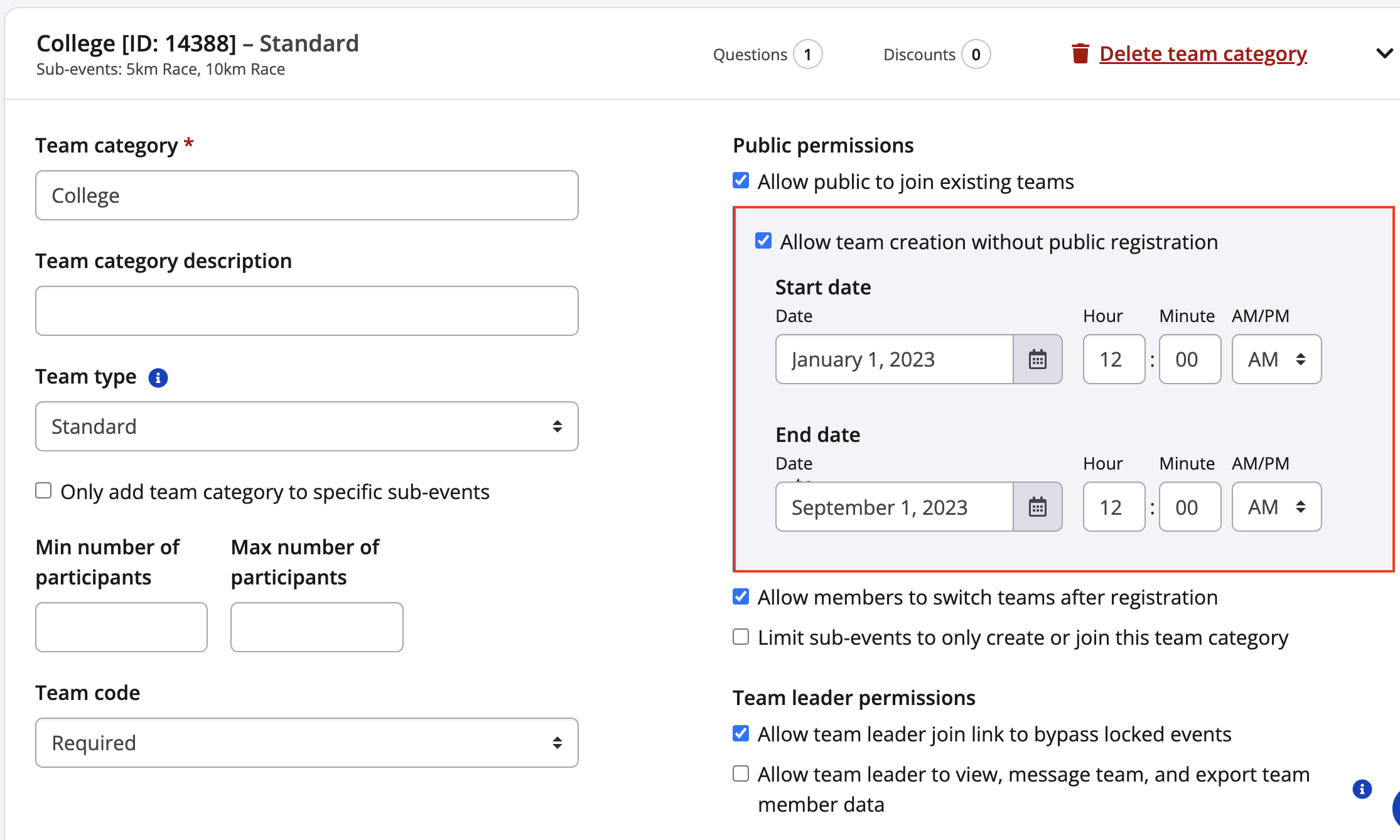 - Select 'Allow Team Creation without Event Registration?' and define start and end dates